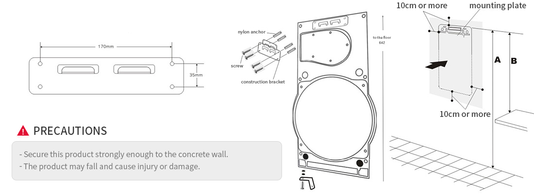 - 01Fix the construction bracket with nylon anchors and screws at the location of the wall to be installed as shown in the figure.